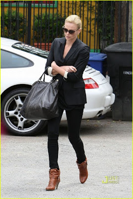 Charlize rocks the "black on black". Scroll on down to see our new perfect Fall must have black blazer to recreate this look!