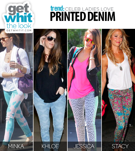 Here at Sugar, our mission is to bring you the latest and greatest in celebrity fashions. What are celebs loving lately? Printed denim. It was a hot trend for Spring and will continue throughout the Fall with geometric patterns rather than florals.