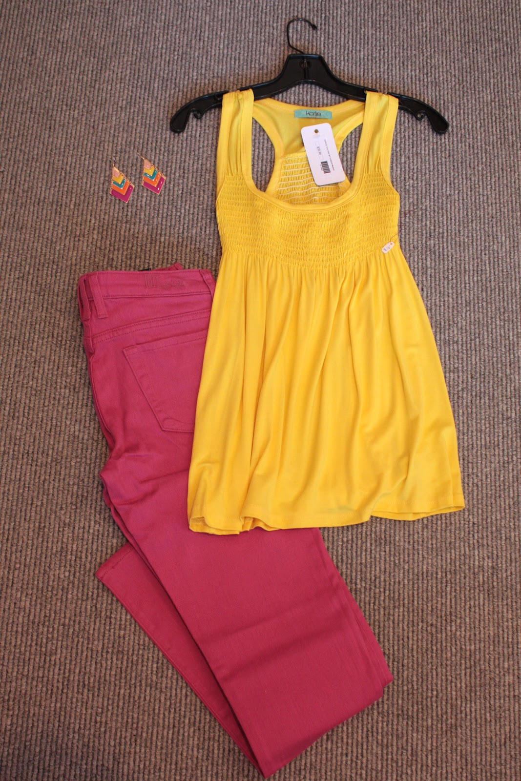If you like a little sleeve coverage and something flowy on top, this Ivy Jane mustard tunic with black stitching also looks great with the pink skinnies. White, aqua, or lime green would look great too! Don't be afraid of color. You can't go wrong with the color blocking trend!