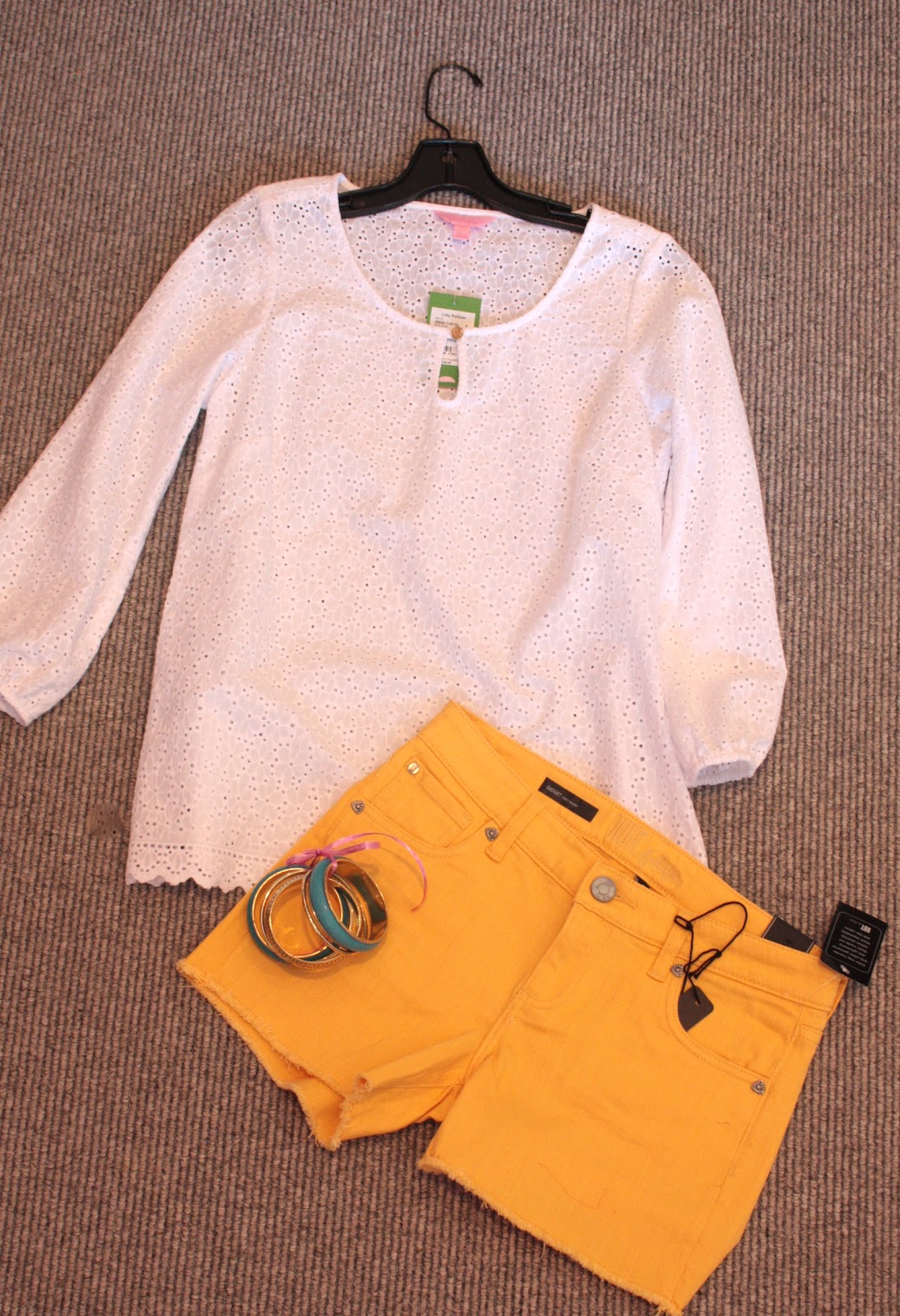 We've paired the "goldenrod yellow" shorts with Lilly Pulitzer's Tenley eyelet tunic to balance it out and bold turquiose bangles to add another splash of color. Wear colorful wedges or nude espadrilles to really accent your legs and make them look even longer!