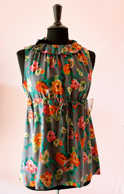 We know you've seen this style from Spring/Summer. Super flattering halter (makes your shoulders look fabulous!) in a trendy Ikat rose print with ruffle neckline and drawstring empire waist. This top looks best with bootcut jeans for Fall and a great colorful pair of wedges, boots, or flats.