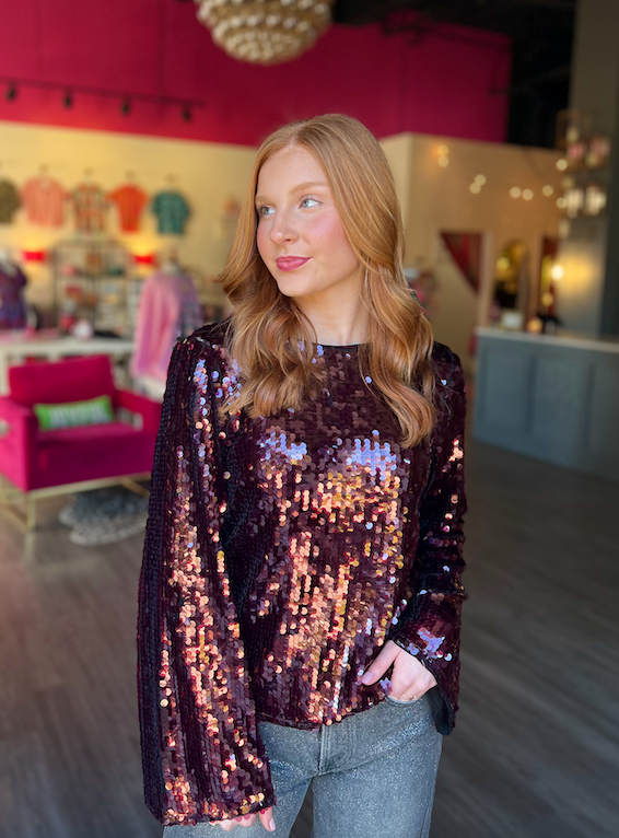 shimmer and sparkle the entire holiday season through + into the new year with this gorgeous MERLOT hue sequin blouse that's perfect with our glittery denim + black denim , a fun skirt ... ANYTHING. Truly a must for our Gamecock fans! So gorgeous...