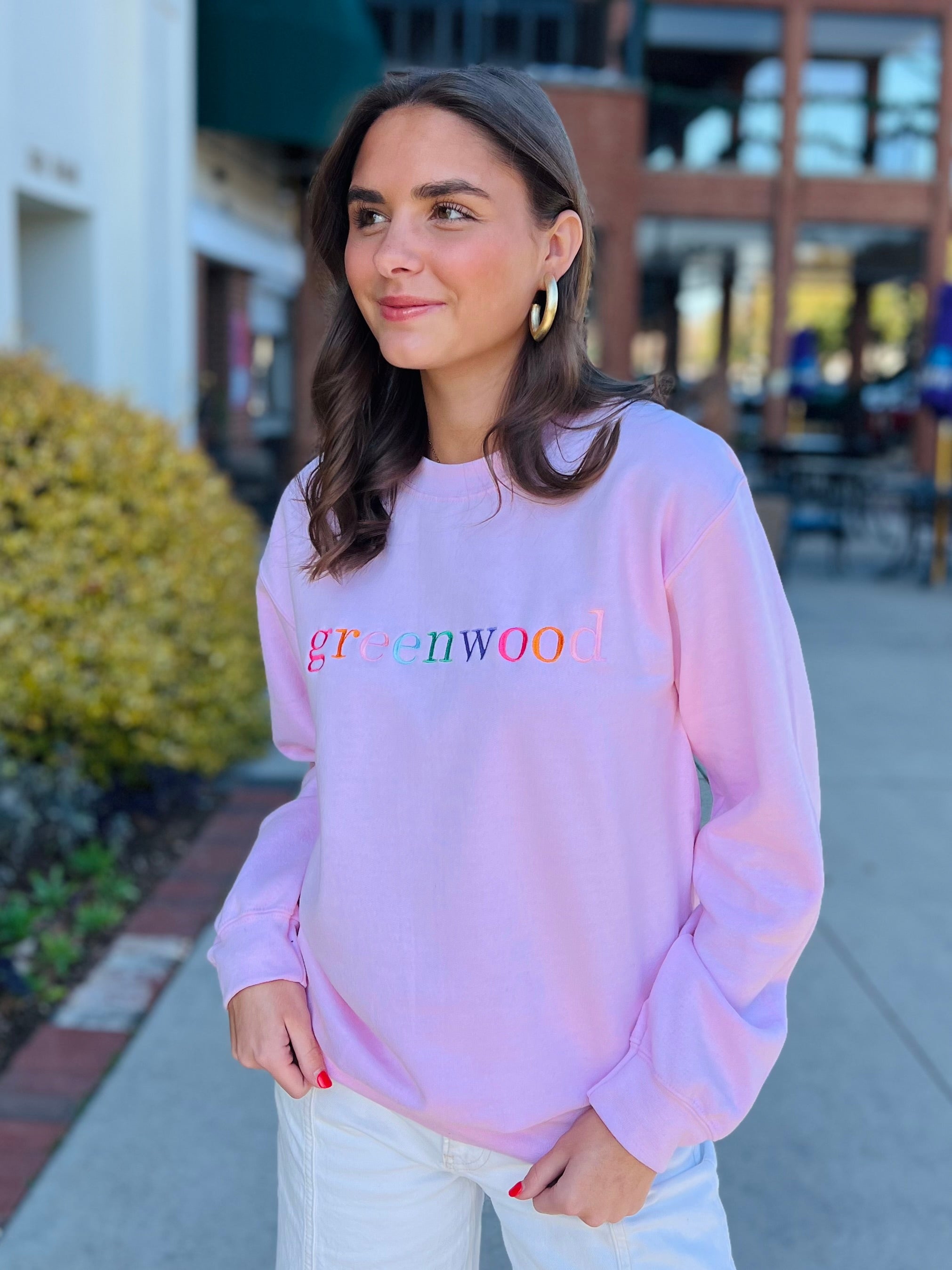the cutest COLORFUL "GREENWOOD" font text sweatshirt embroidered on a light pink sweatshirt that's oh-so- US am i right? Show off your GREENWOOD pride with this fun, colorful sweatshirt, perfect for all through the year