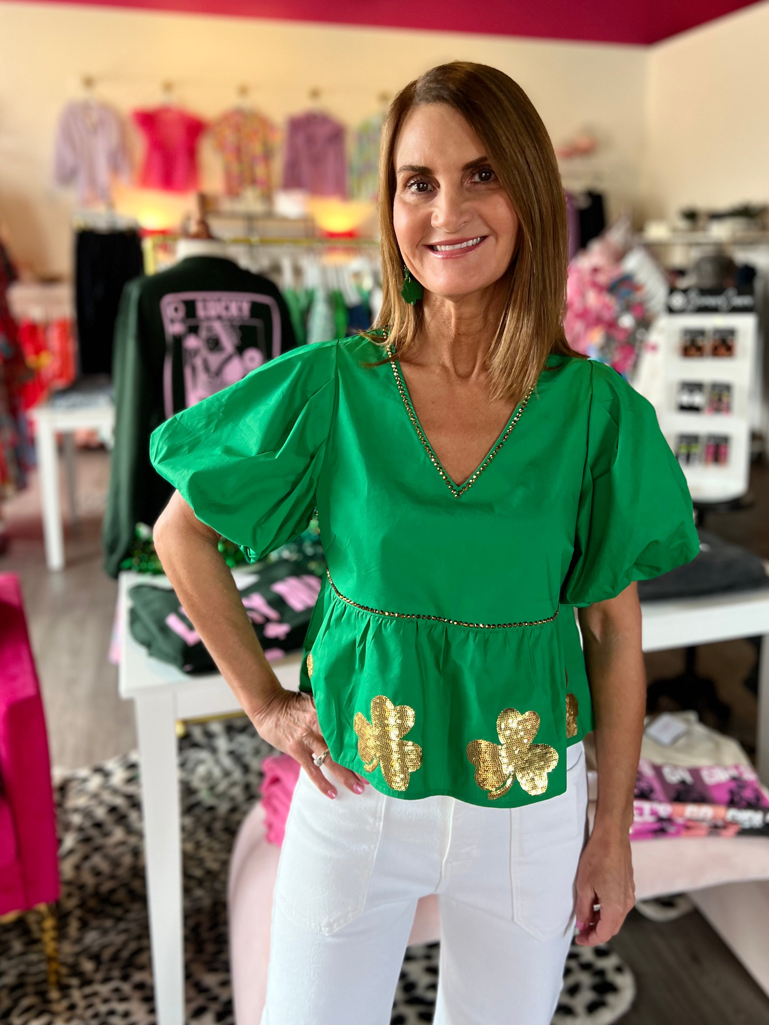 the classic peplum Queen style you know and love, back in this gorgeous green with gold shamrocks - sure to make your St Patty's day SHINE