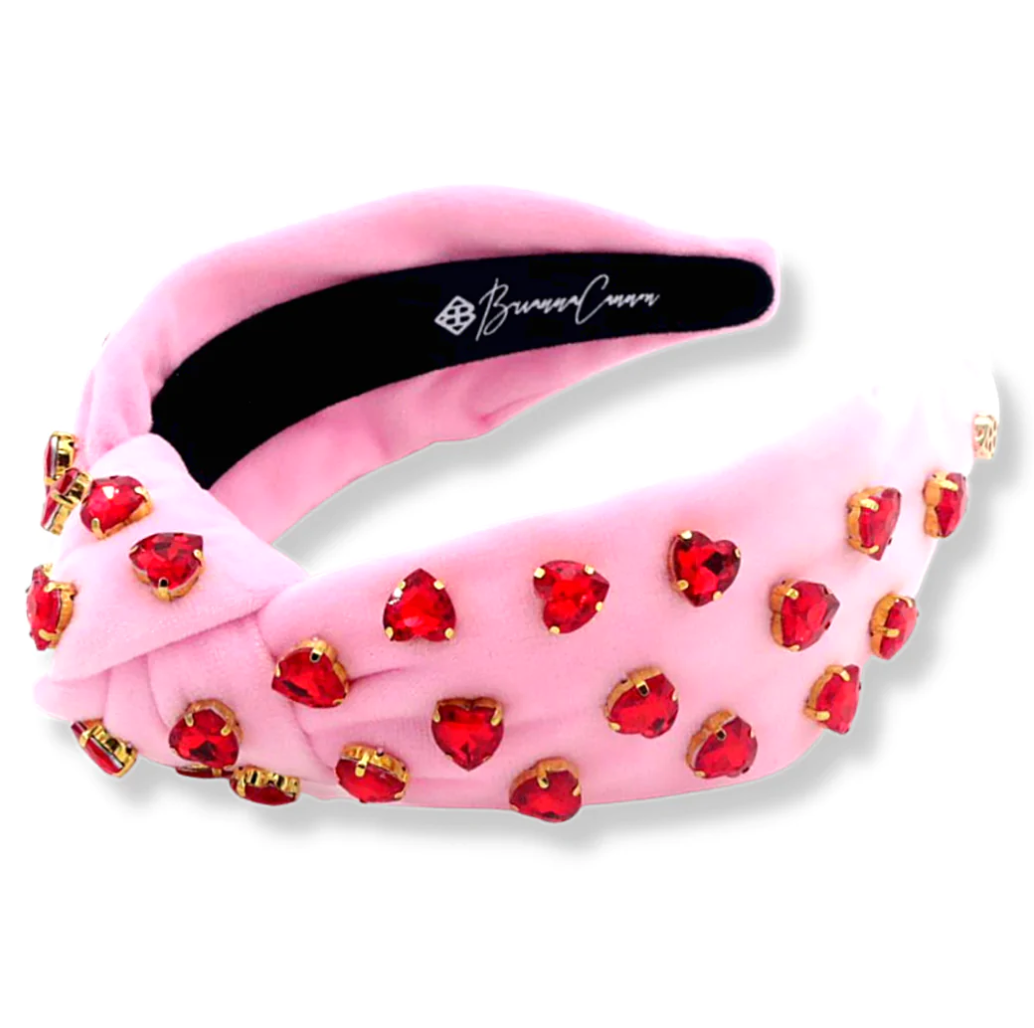 • Pink velvet Knotted headband with red crystal hearts.