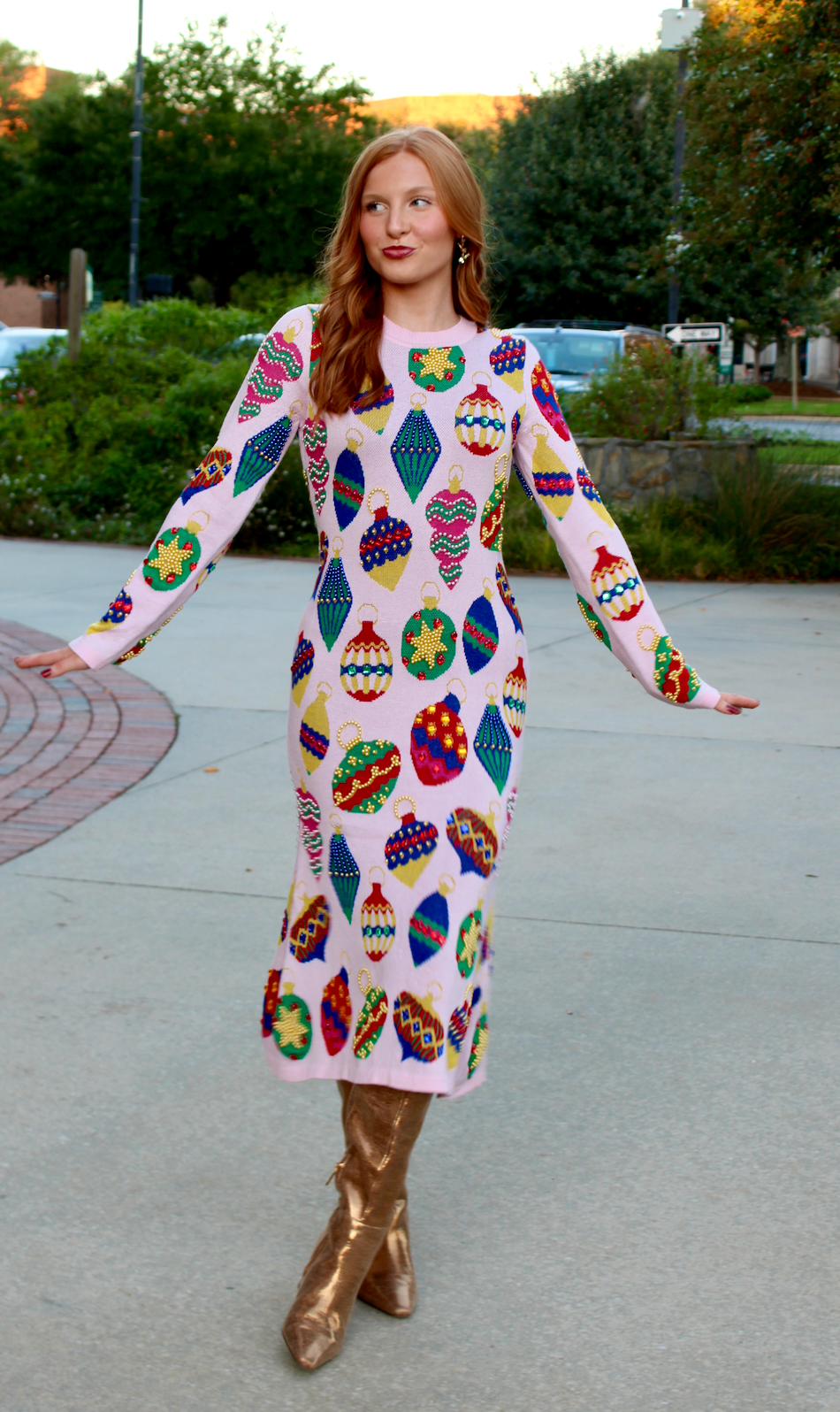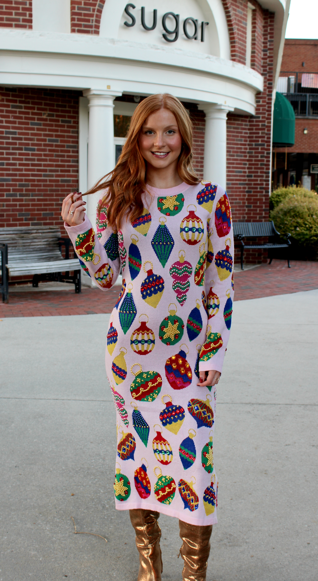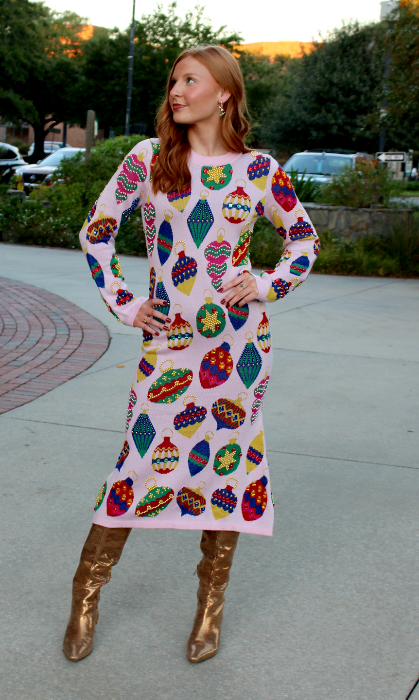 the WOW statement dress that's going to turn heads every. single. time! We had this fabulous ornament adorned knit sweater dress last year and it FLEW out in a matter of minutes, so don't miss it again back in this gorgeous light pink.