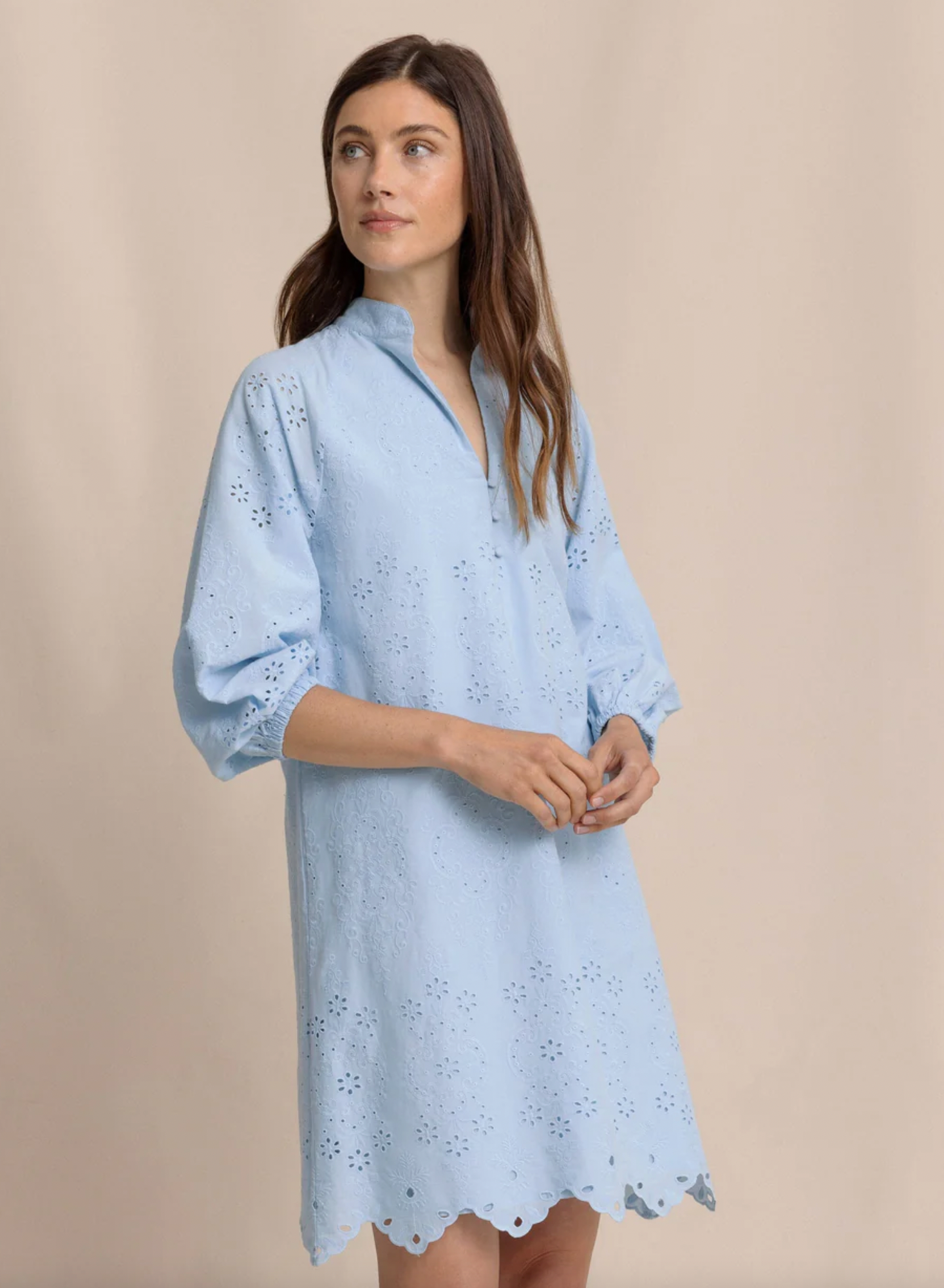 The Mandy Embroidered Bubble Sleeve Dress blends effortless charm with refined detail. Crafted from 100% cotton, it features bubble sleeves and delicate embroidery that add texture and elegance to its timeless silhouette. Light and versatile, it’s a warm-weather staple designed for both casual days and special occasions.
